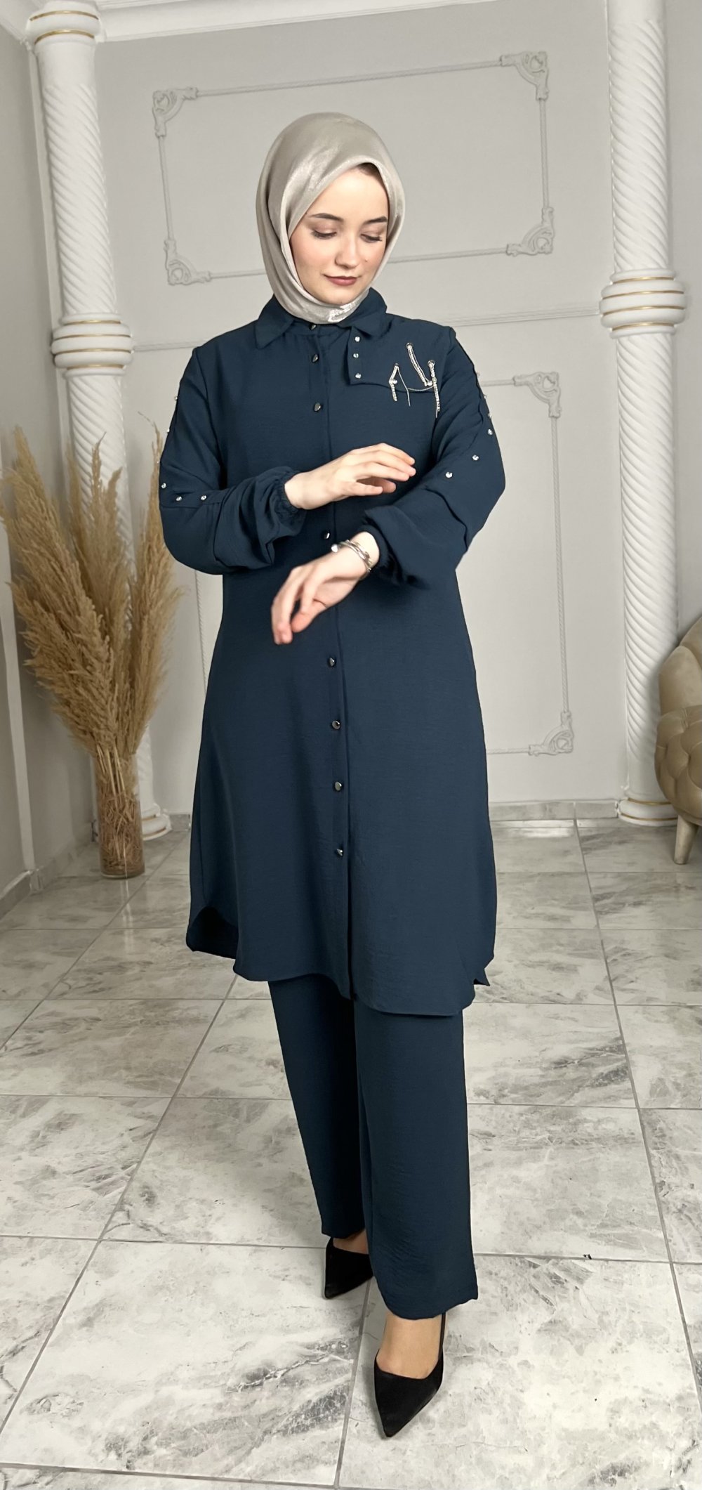Tunik boydan metal düğmeli taş zincir detaylıdır.