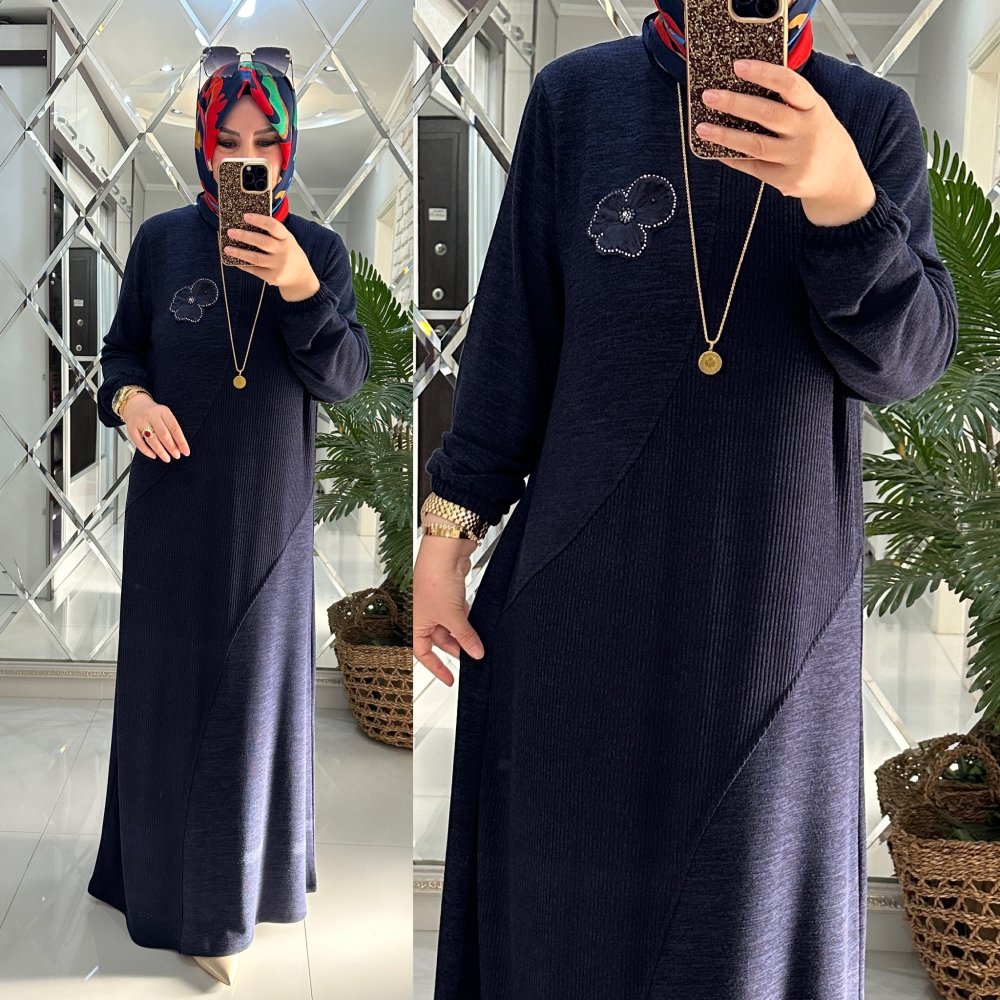-140 cm uzunluğunda, yakasında çiçek motifi süslemeli