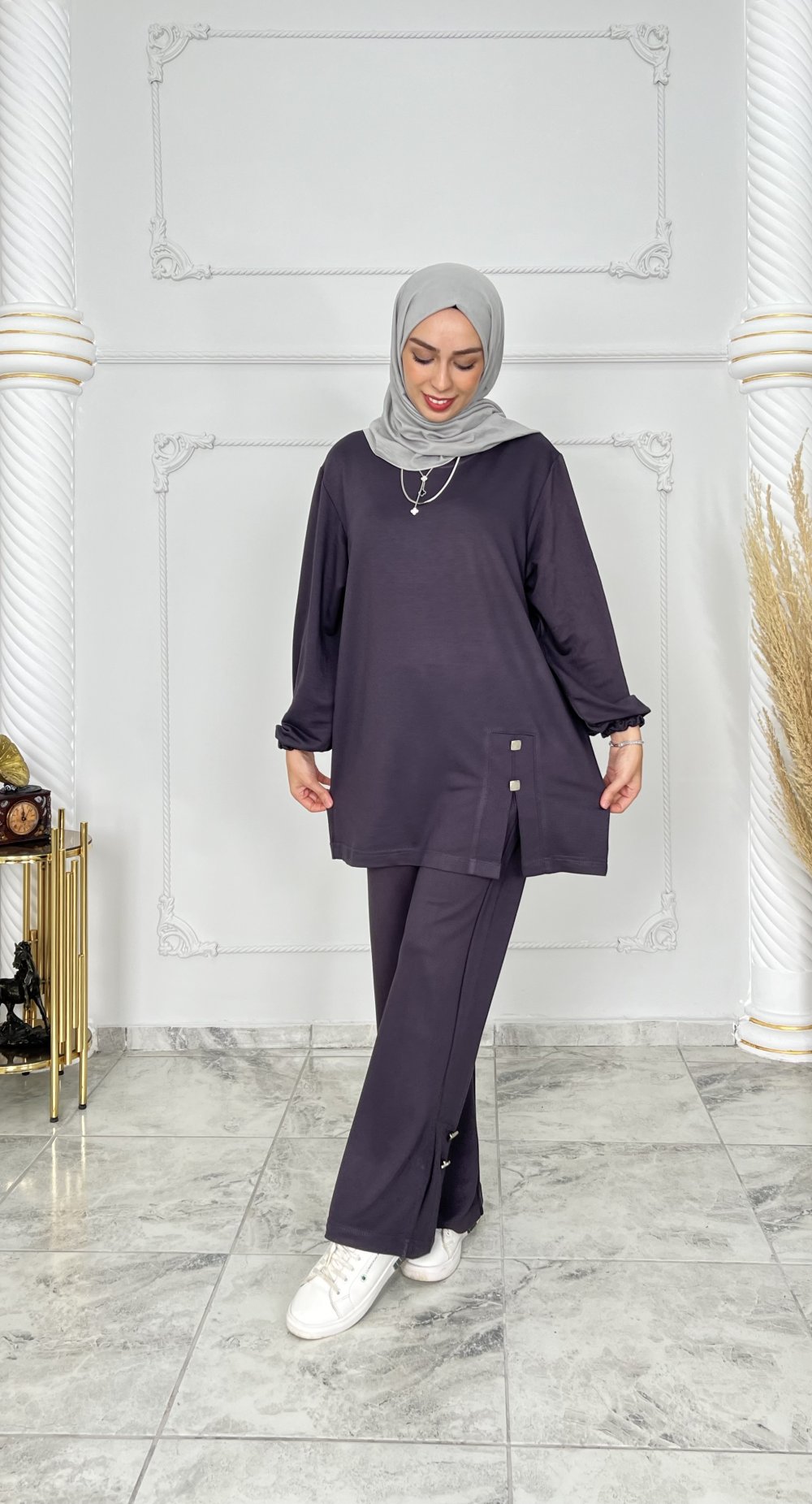 Tunik ve pantolonda metal aksesuarlar vardır