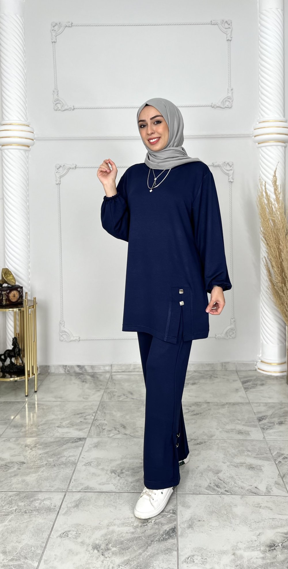 Tunik ve pantolonda metal aksesuarlar vardır
