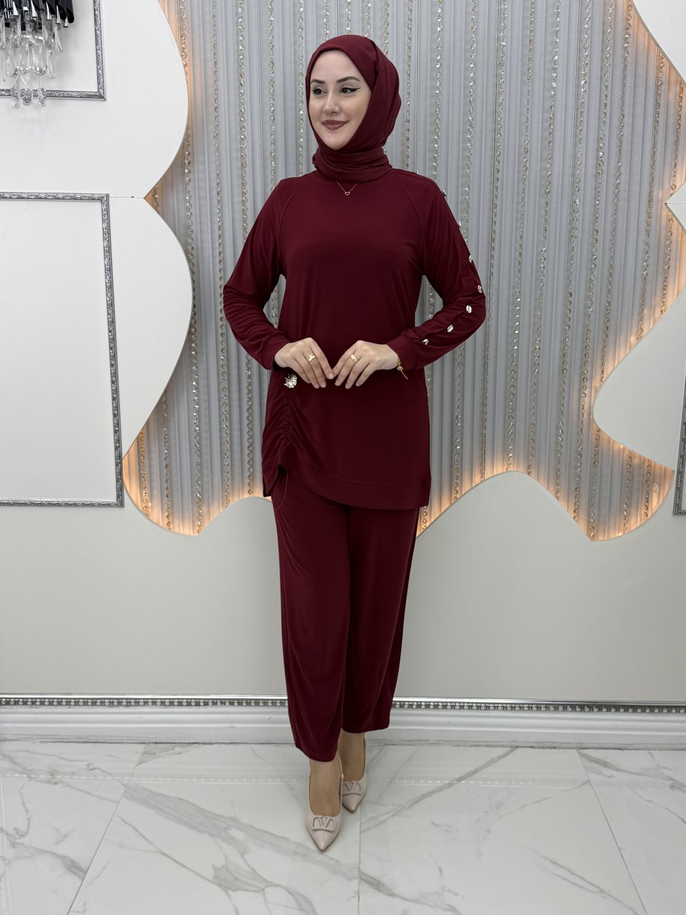 Büzgü pantolonlu takım Bordo