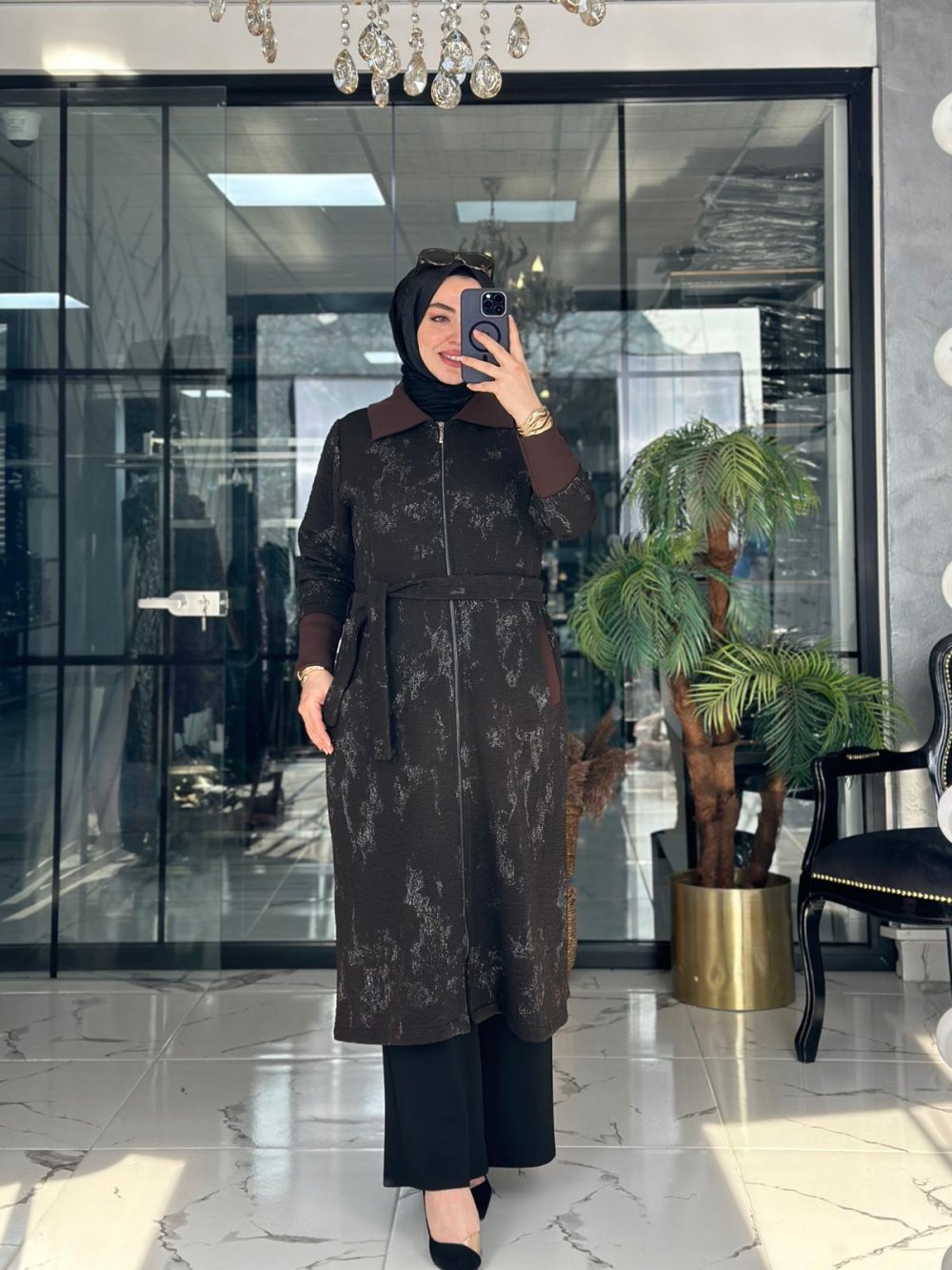 Kumaşı desenli dokuma kumaştır. Önü fermuarlıdır. Seyyar kemeri vardır.