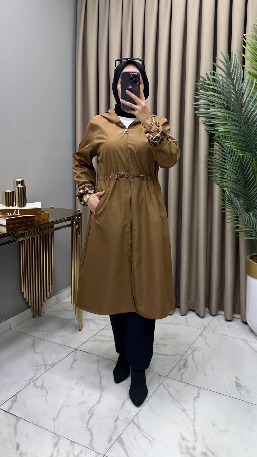 Leopar astarlı, cepli, fermuarlı , bağcıklı, kapşonlu. Boy 110 cm