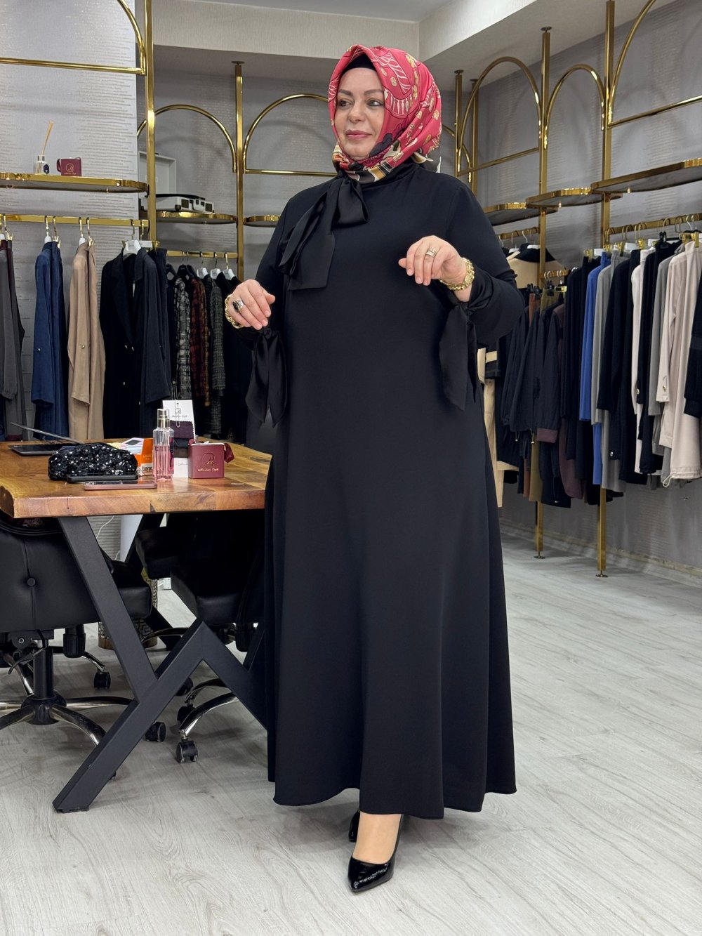 Kumaşı kreptir. Arkası yarım fermuarlıdır.