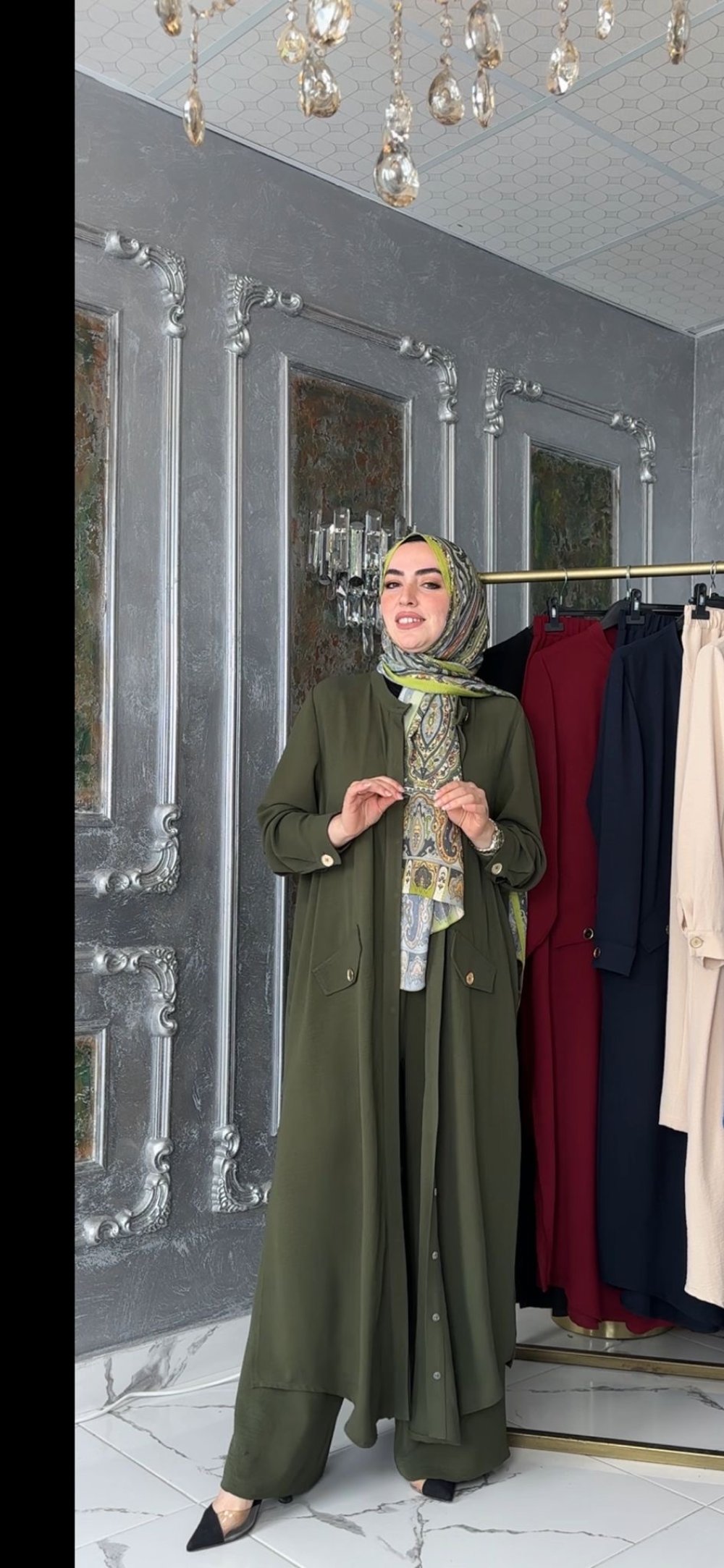 Kumaşı krep kumaştır. Kap Sahte Cep Kapaklı,Kol Ağızı Manşet Düğme,Kap Yan Yırtmaçlı,Pantolon Bel Lastiklidir.
