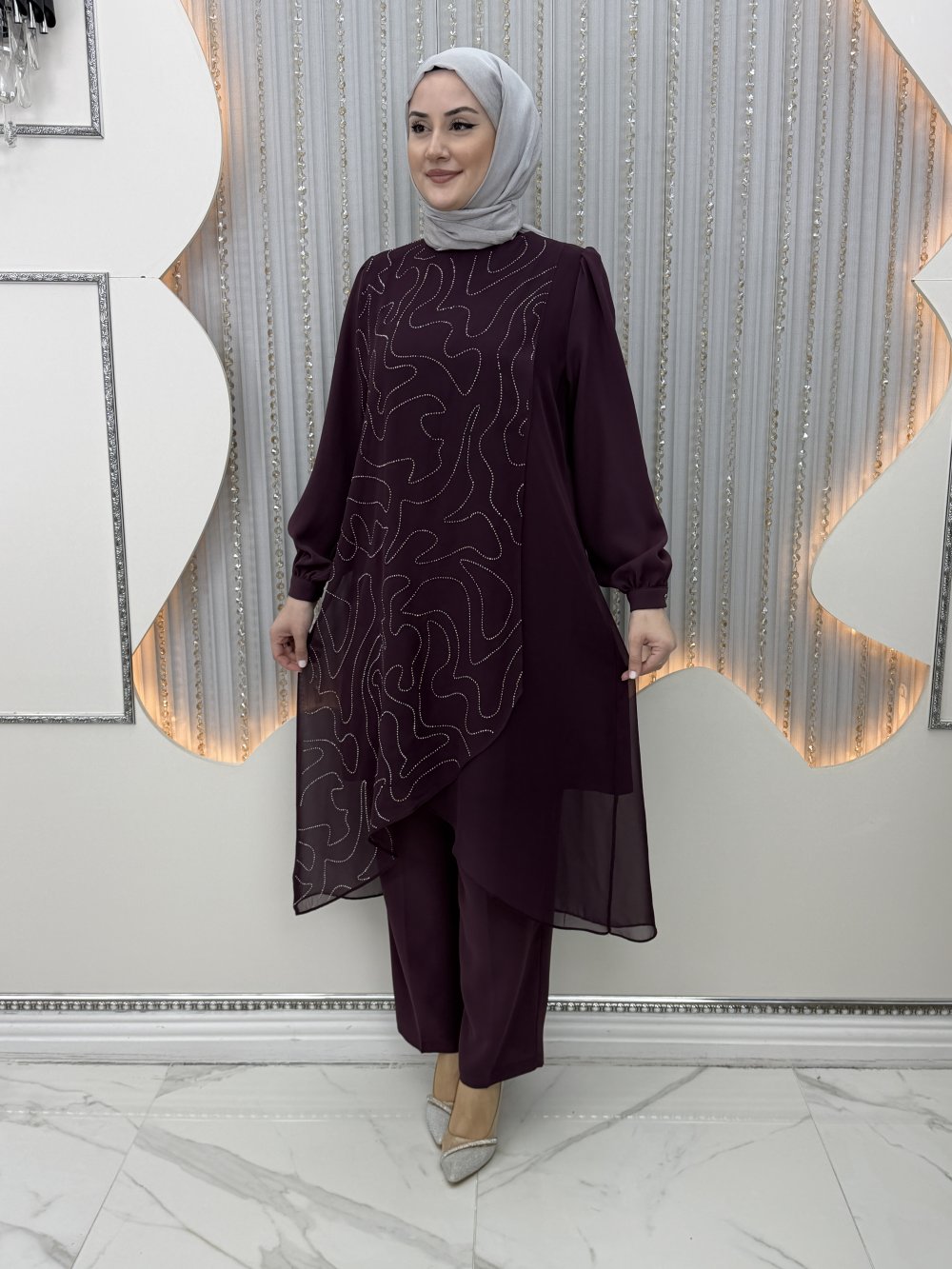 Parlayan Pantolonlu Takım Mor