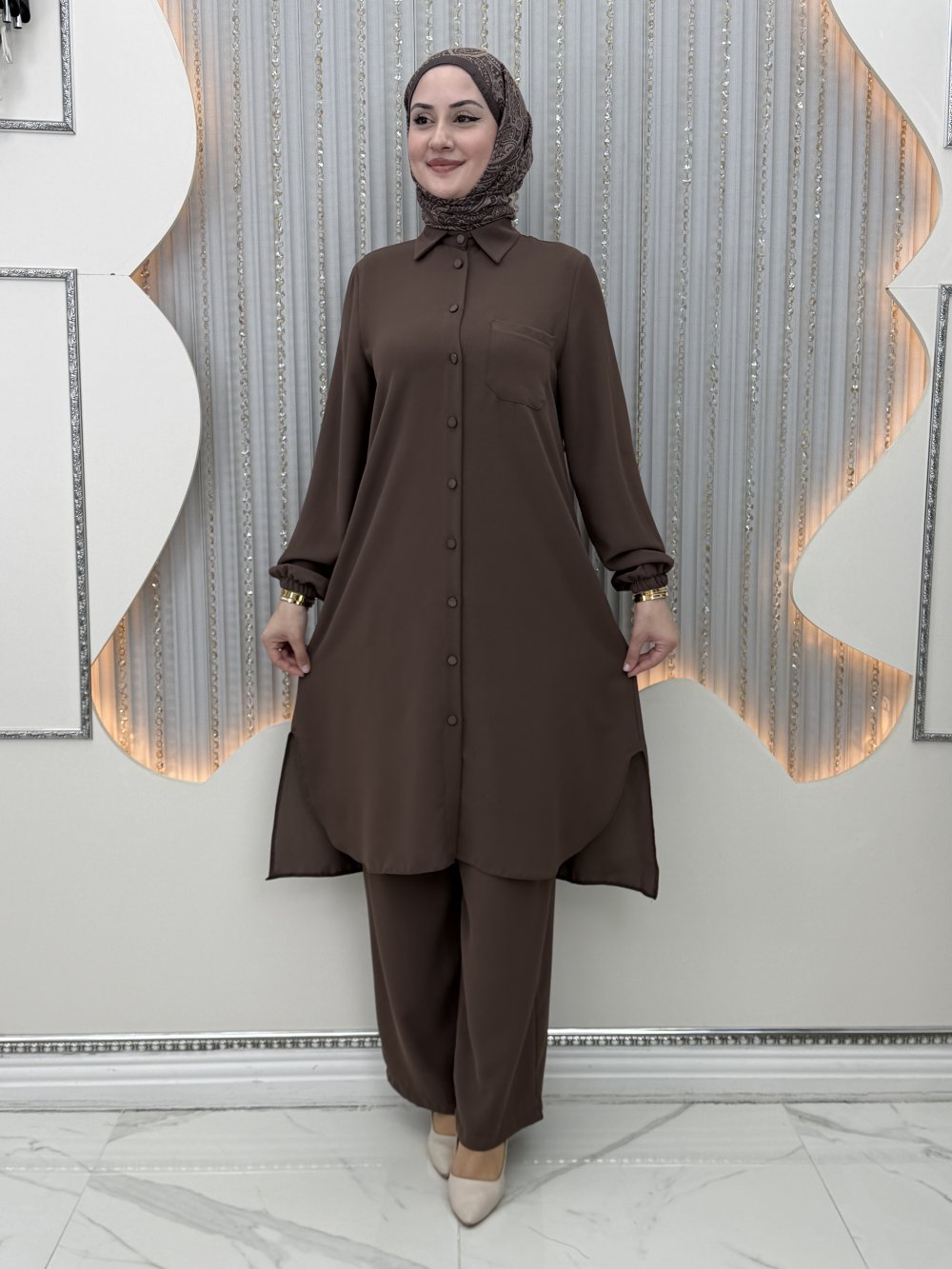 Rozalin Pantolonlu Takım Kahverengi