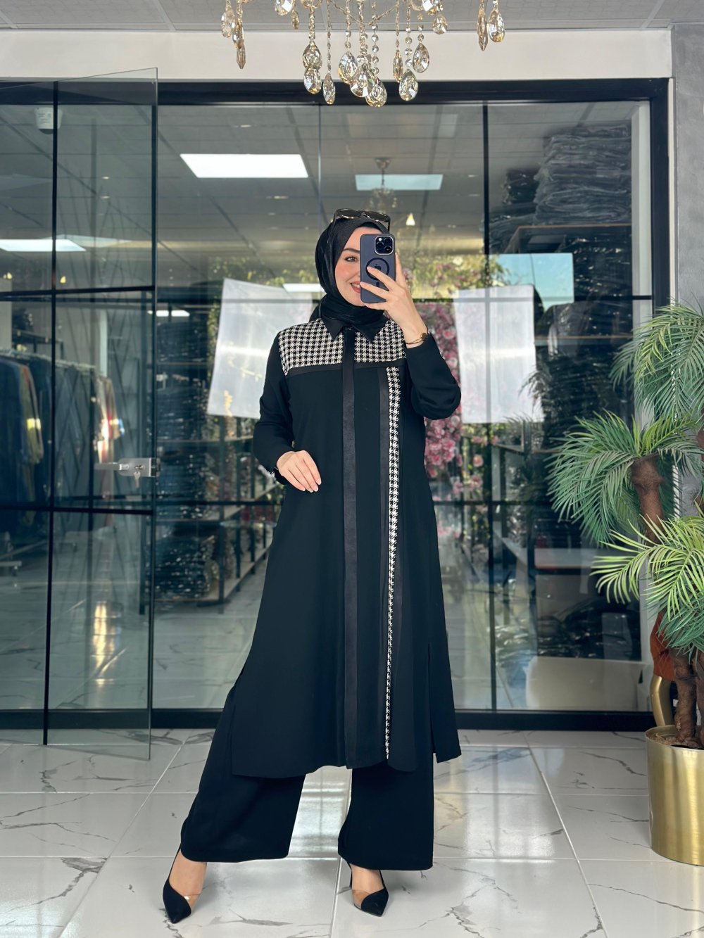 Kumaşı kreptir. Örme kazayağı detayları vardır. Önü düğmelidir.
