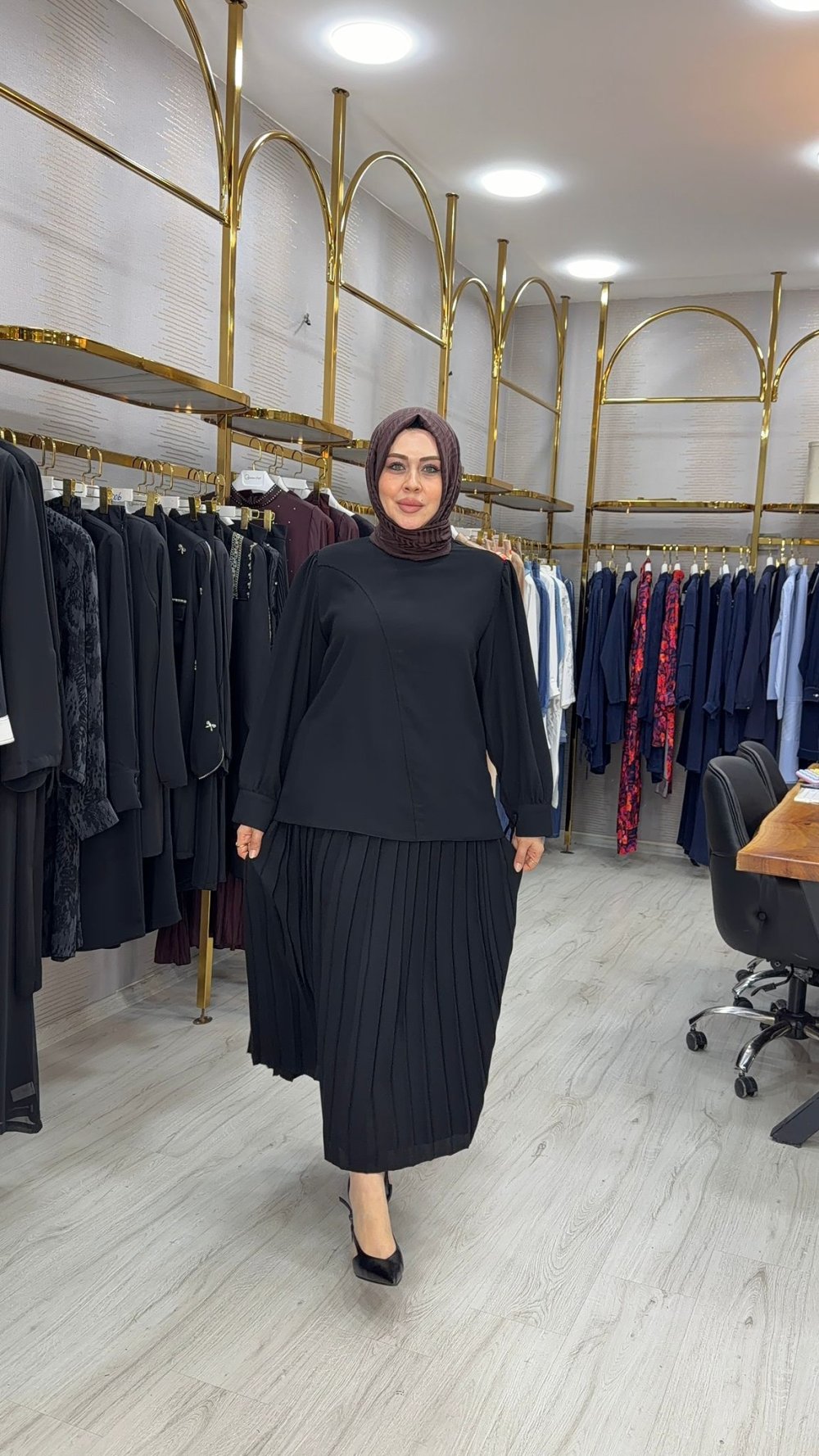Kumaşı kreptir. Arkası yarım fermuarlıdır. Etek beli lastiklidir.