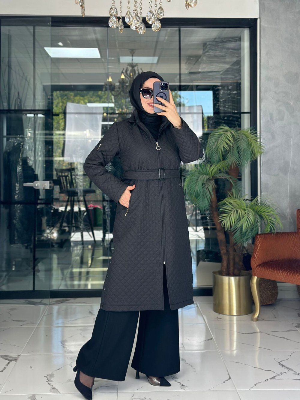 Kumaşı kapitonedir. Şapkası çıkabilir. Cepleri fermuarlıdır. Seyyar kemerlidir.