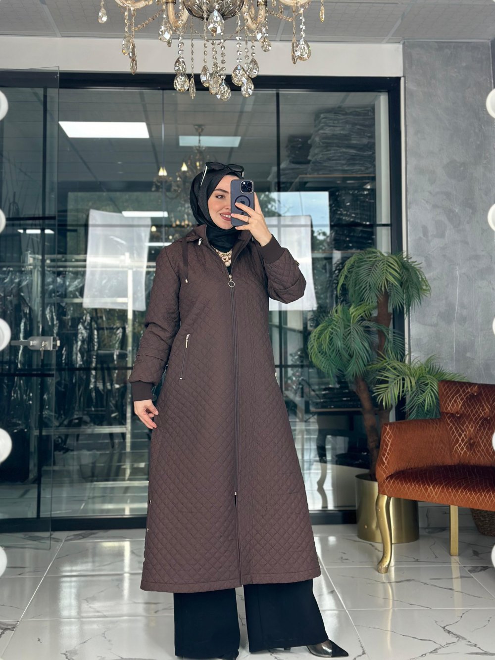 Kumaşı kapitonedir. Şapkası çıkabilir. Cepleri fermuarlıdır. Seyyar kemerlidir.