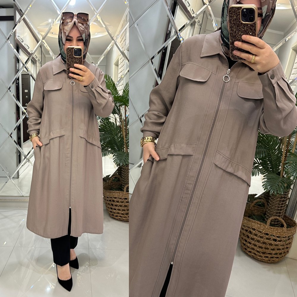 -Gömlek yaka, fermuarlı, ön kısmında pile detayı, kolları çıtçıtlı
